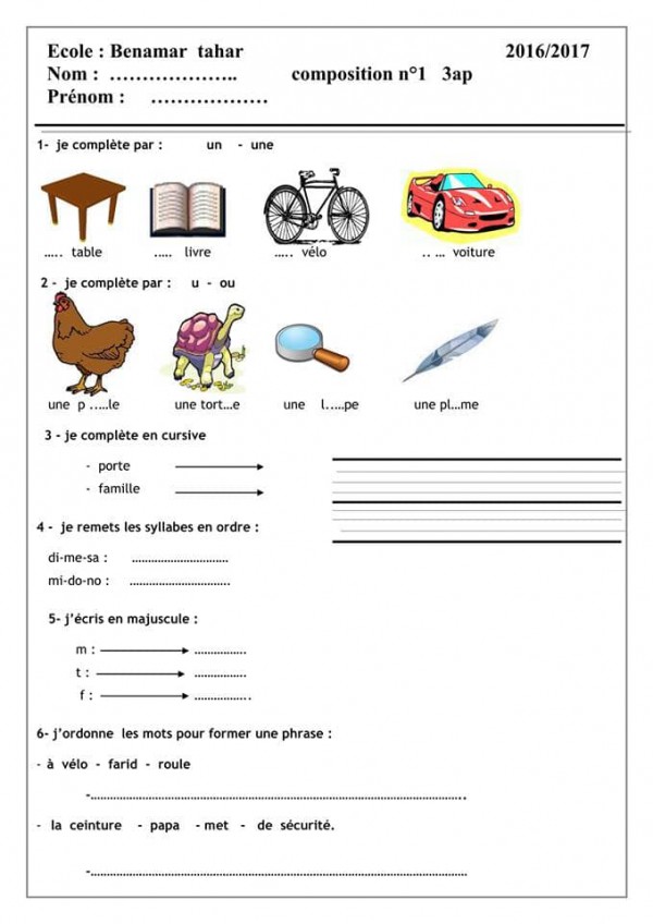 نموذج اختبار الفرنسية للسنة الثالثة ابتدائي مجتمع الحلول
