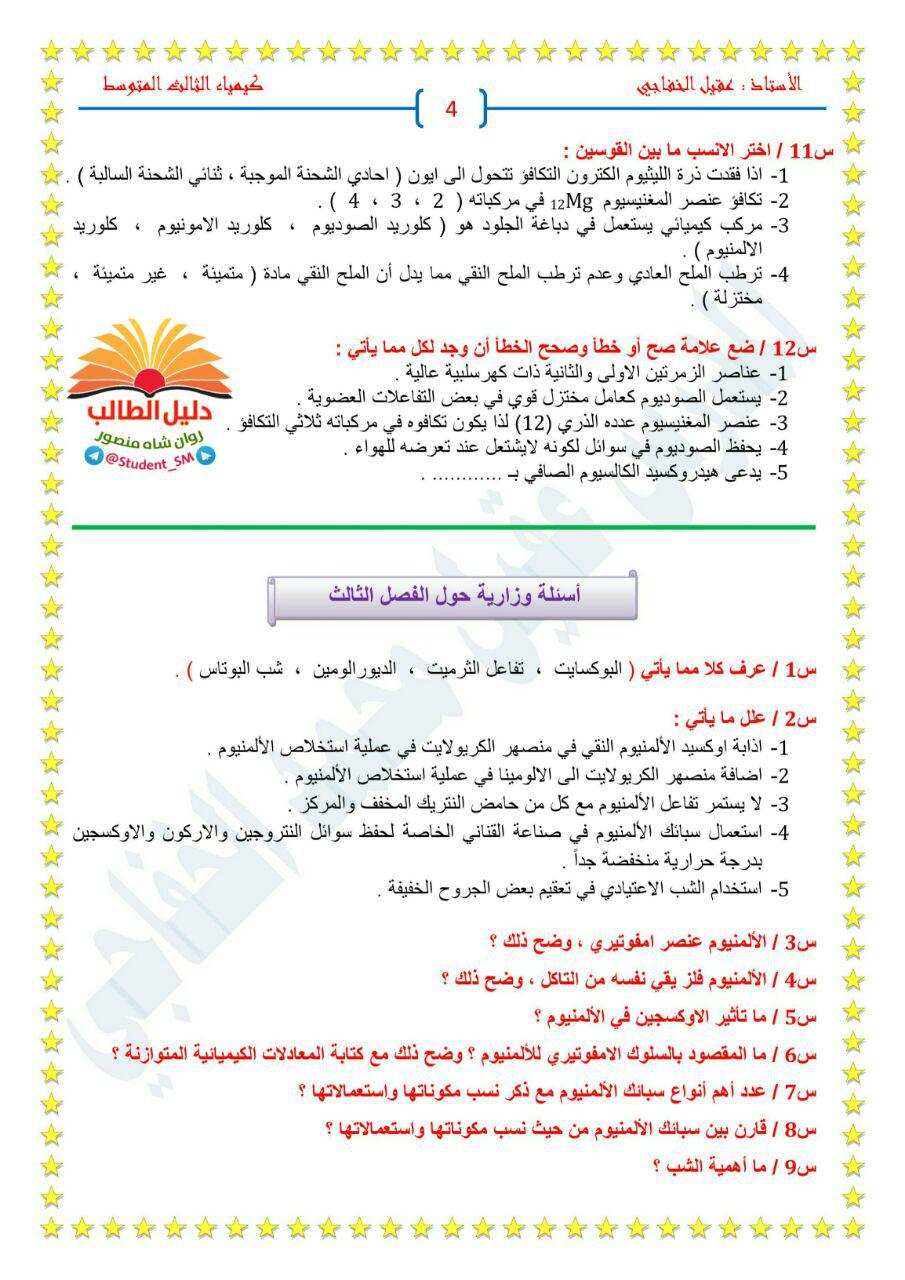 مجموعة أسئلة وزارية الكيمياء الثالث متوسط حسب الفصول للاستاذ عقيل الخفاجي